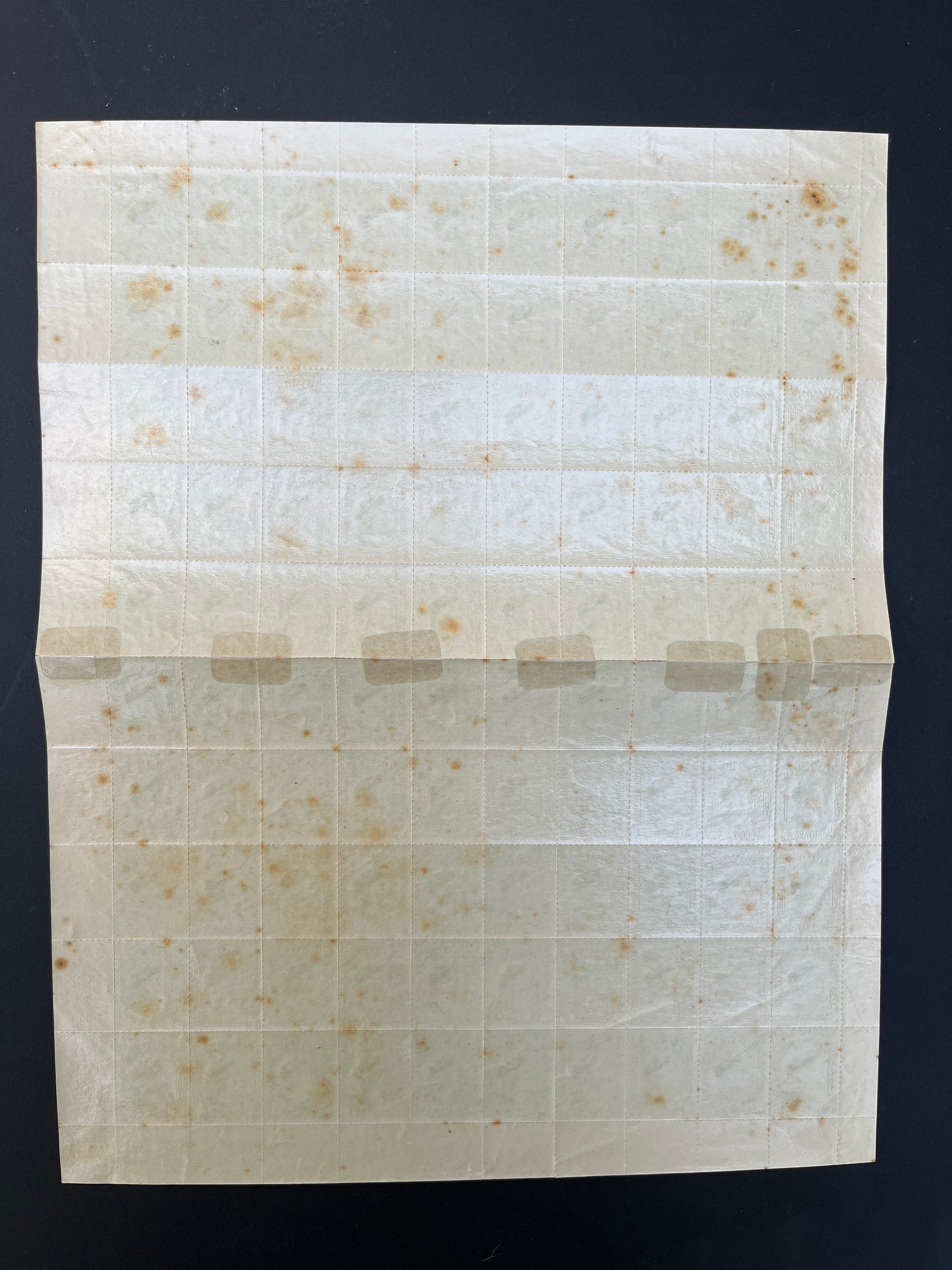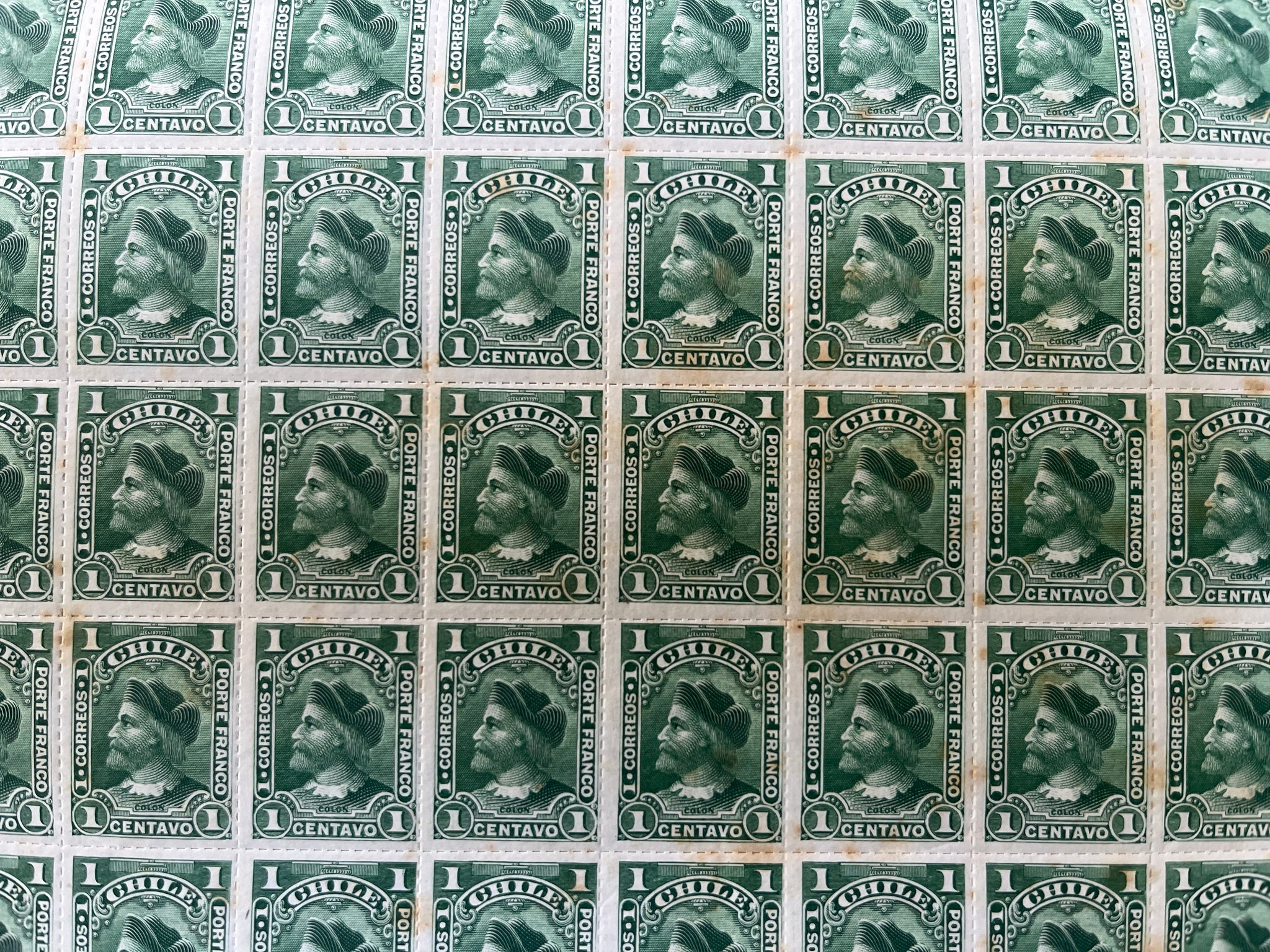 Full sheet of the Waterlow printed, Scott Type 1 Cabezones, including sheet number to top right. Hinges on one row of stamps but otherwise unmounted mint. Foxing spots as per the images. Scarce as a full sheet.
