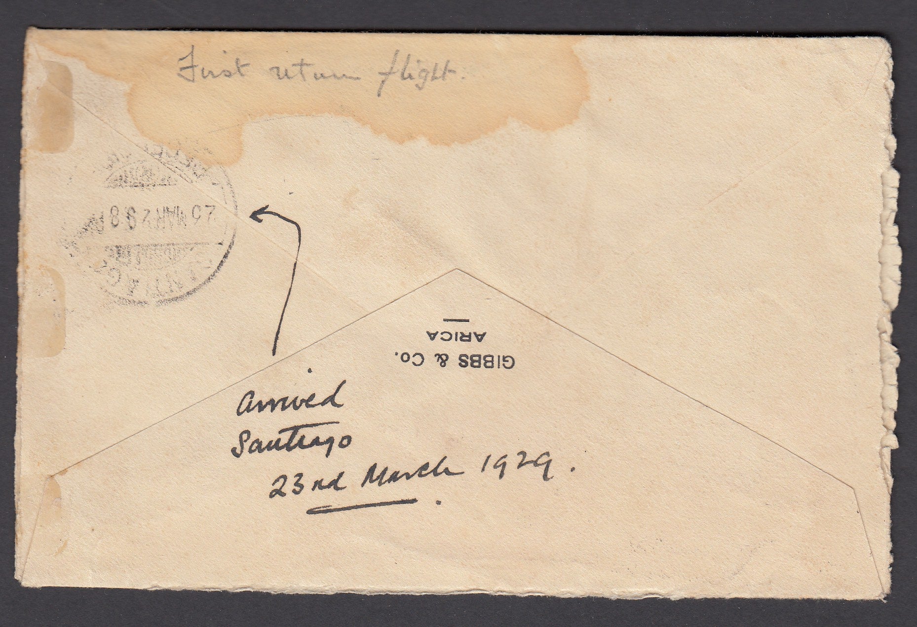 The first official return flight of Chile's newly inaugurated airline took place on March 6th 1929 although letters were cancelled with a 7th March date stamp. The plane had to make a forced landing and crashed, the mail finally arriving in Santiago on 23rd March.