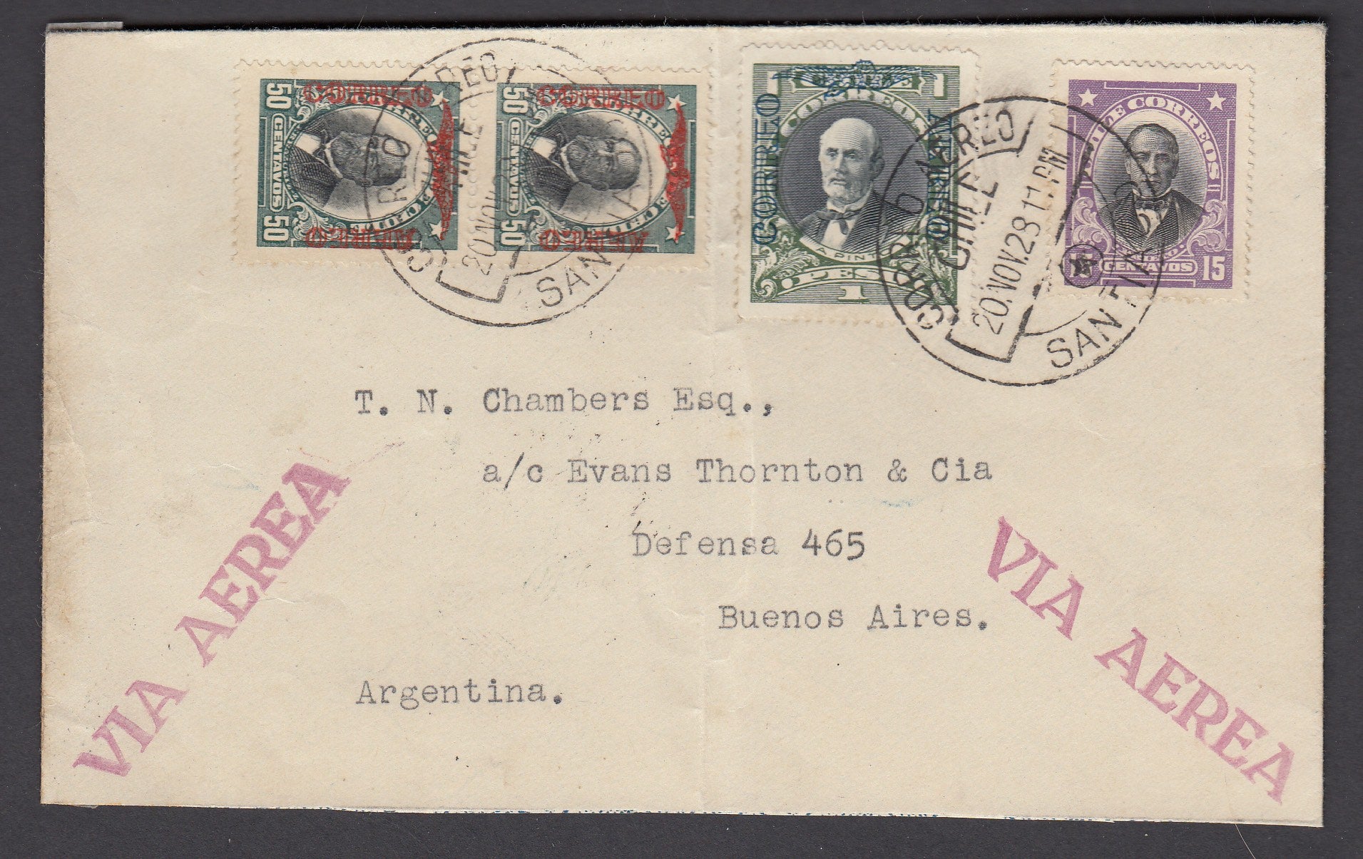 An important landmark in early Chilean aviation. Up until this experimental reconnaisance flight, letters bound for Argentina were initially transported on the Transandino rail service through the Andes. On 21/11/28 Jean Mermoz and his mechanic Alexandre Collenote made their first test flight to transport mail from Santiago to Mendoza and on to Buenos Aires with their Late 25 plane. All mail carried the cancellation “A expedier de Buenos Ayres 22 Nov 1928”. The success of the flight led to the first official airmail flight in July 1929.
