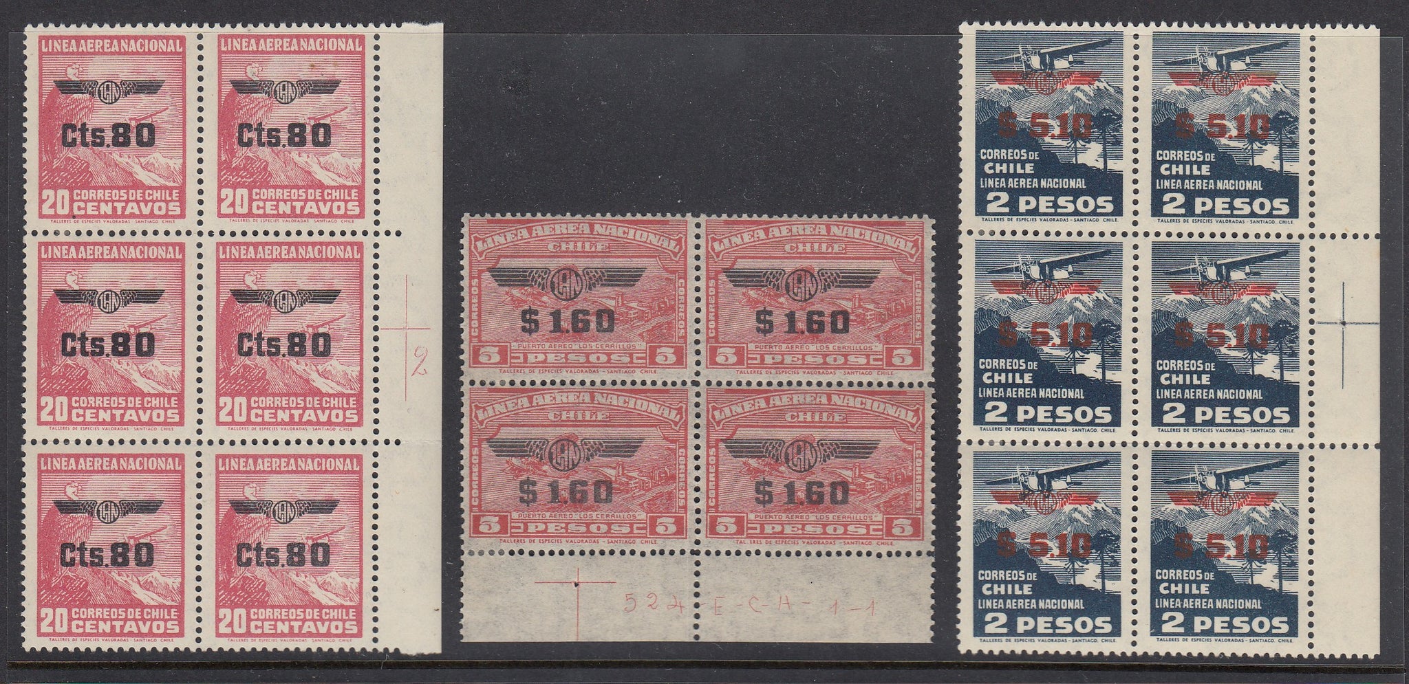 Three Official Seals from the 1894 issue: Type I (CHILE shading to the right), Type II (CHILE shading centered) and Type III (bust of Columbus changed). Shades of reddish-lilac to lilac brown.$50.00