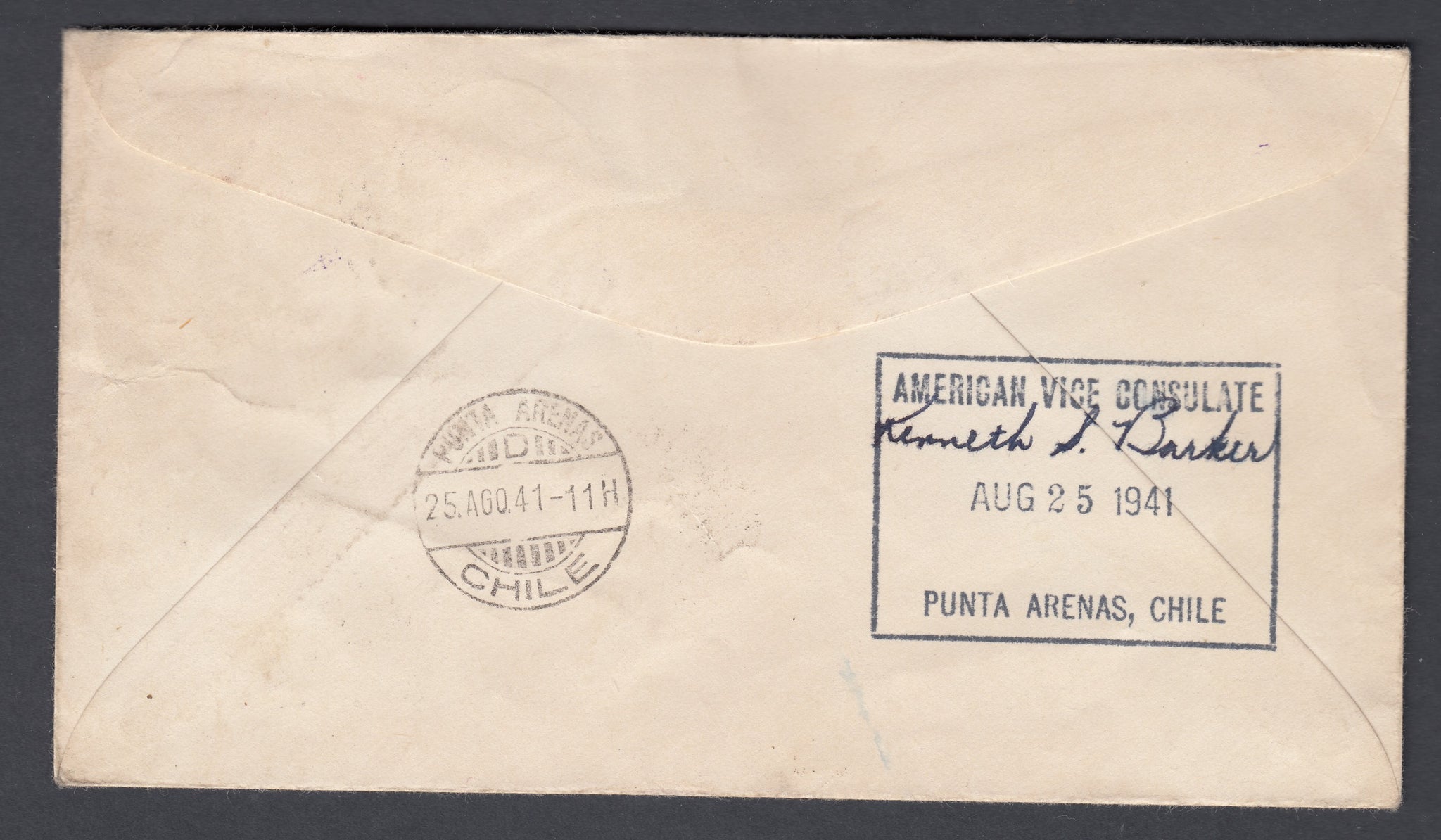 "Later that night, in the tiny sale of the Galvarino, we brought out a number of expedition envelopes, which we intended to mail back to the States upon our arrival again in Magallanes. Cornerwise across them, we typed: "This envelope carried around Cape Horn August 19, 1941, at 3:00 P.M. by the Chilean Naval Tender 'Galvarino,' Wind, S.W. 7. seas heavy." Beneath that, the Commander of the Galvarino put his official stamp and signed each one in ink. Later at Magallanes, Comandante Arroyo did the same. It was official proof that we had "filled to the letter, the slogan of the Expedition: we had gone “From Detroit to Cape Horn!"